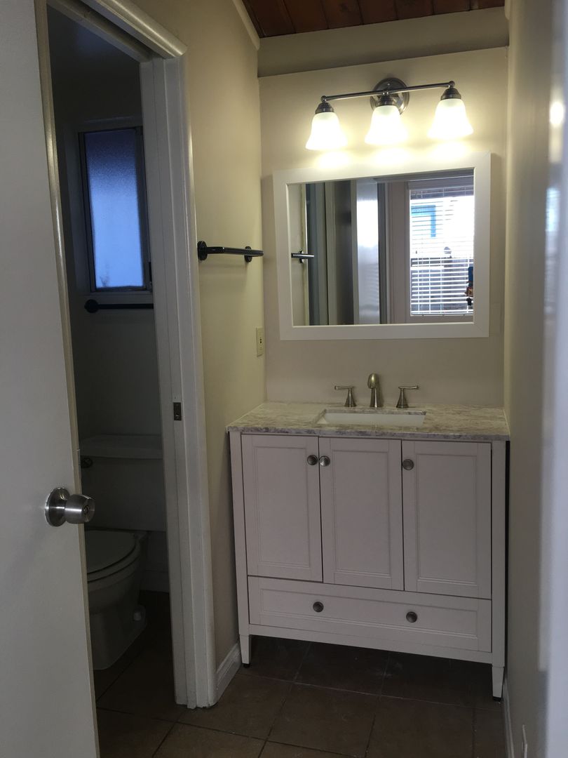 Kitchen features quartz counter tops and elegant subway tiled backsplash. Unit boasts open beamed ceilings, large picture windows, and bedroom loft helps add to the already charming ambiance.