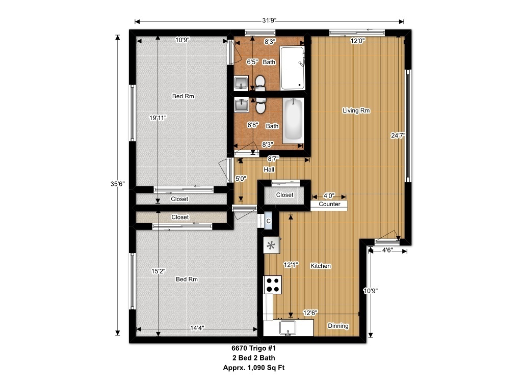 The kitchens are eat-in style with lots of counter space, and plenty of room for a dining table. The master bedroom has a separate bathroom with shower. Both bedrooms are just a touch smaller than the living room, so we dare you to fill it up! Vinyl plank flooring in all units. Two (2) assigned parking space per unit at a rate of $100 per month. Laundry on-site, and we pay for water and trash. 5 people OK! *Prices Subject to Change without Notice* floor-plan pictured may be a mirror image of the actual plan.