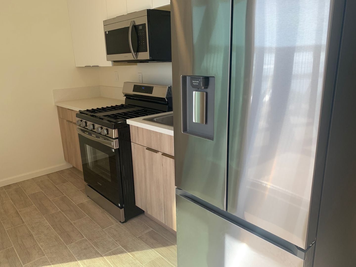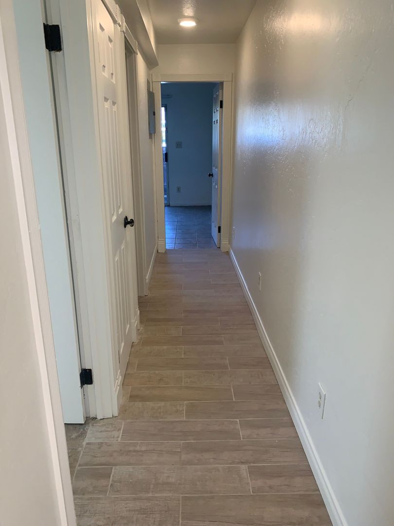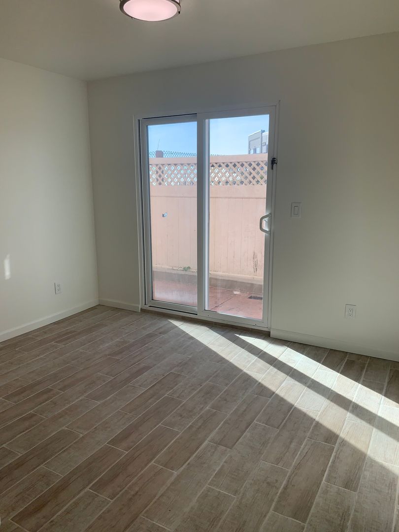 This unit features a private patio, and fully upgraded kitchen with new cabinets, countertops, sink, gas stove, refrigerator, and microwave.