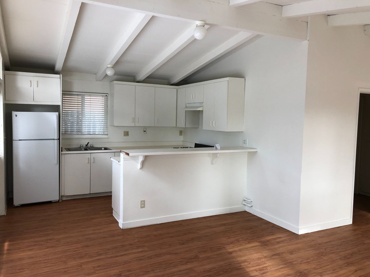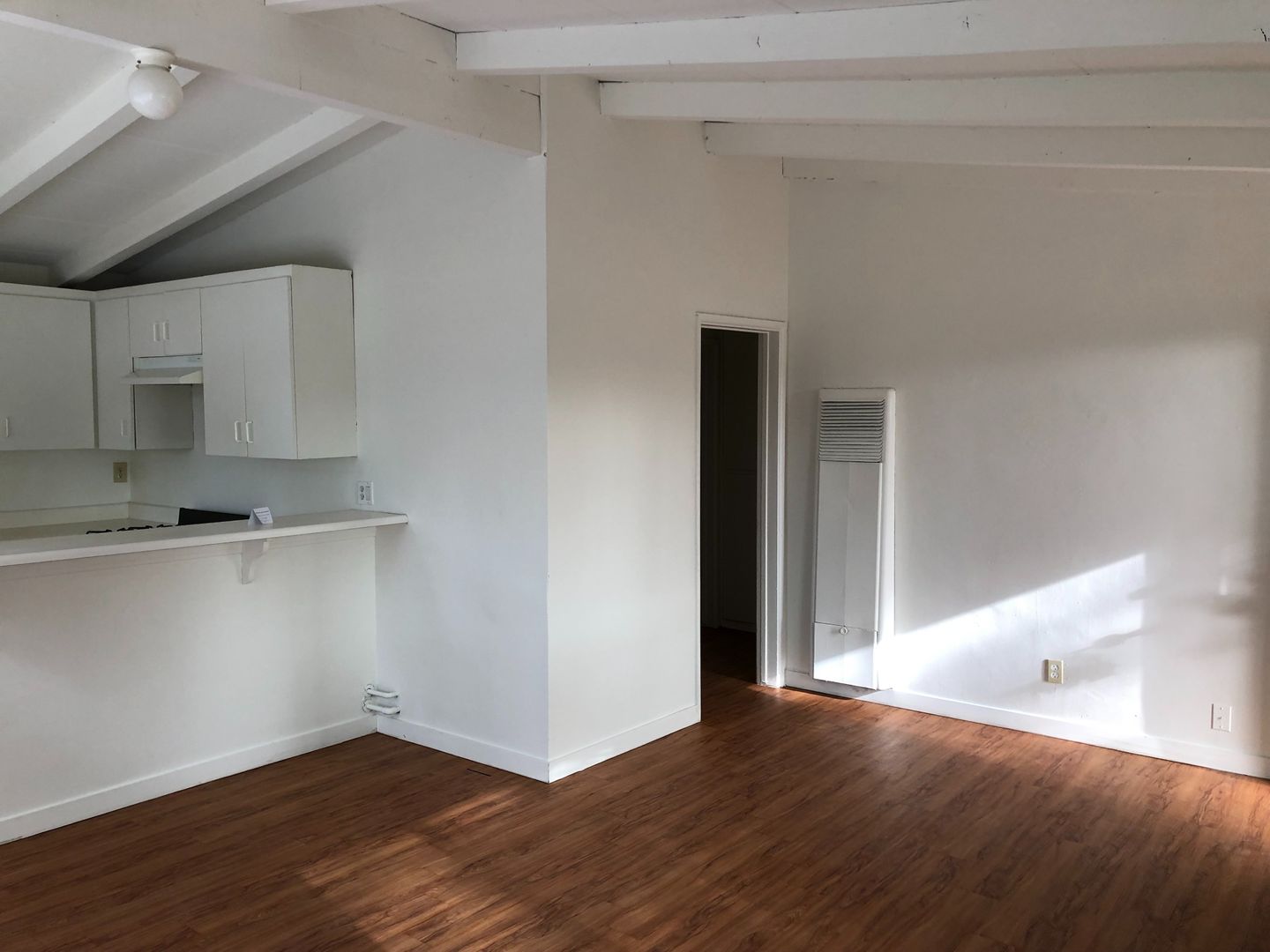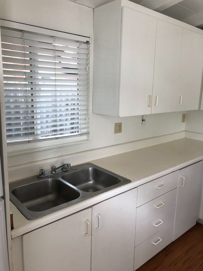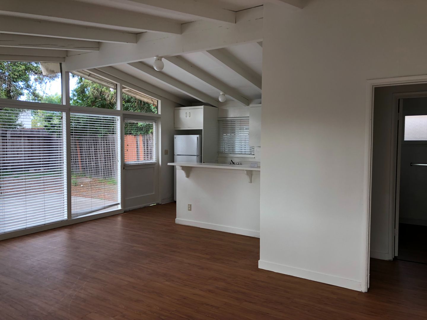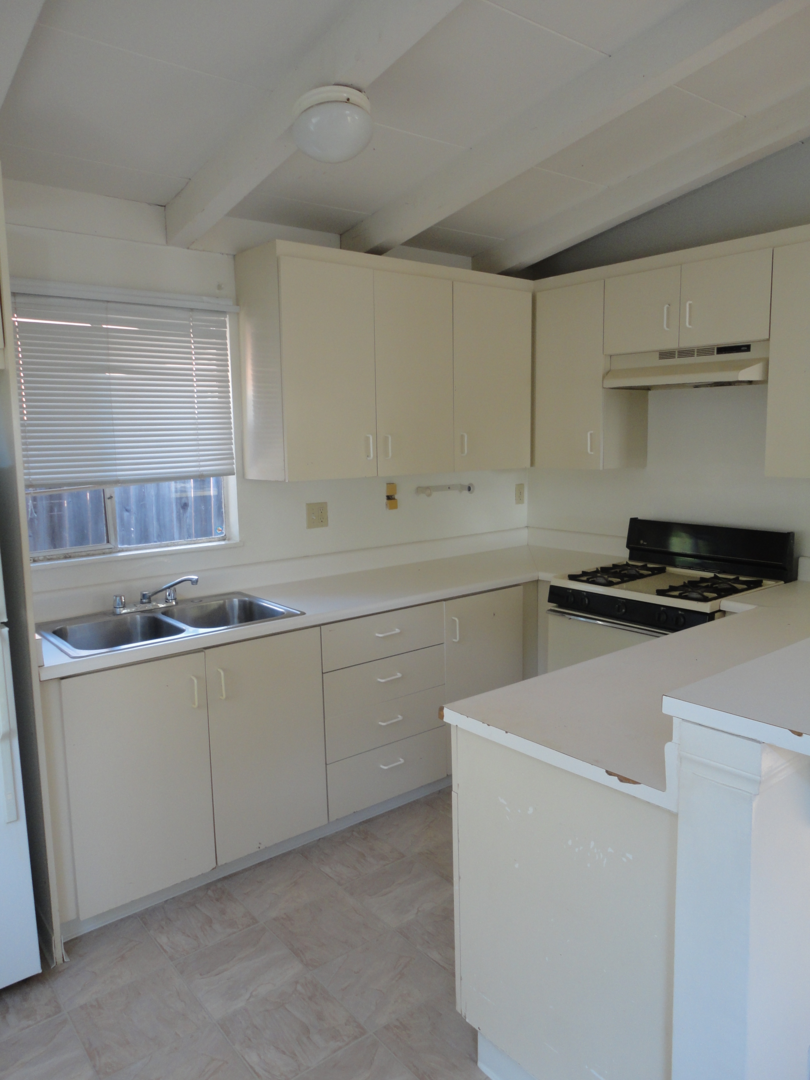 Unit is located at the back of a long driveway which reduces the random foot traffic. Vaulted & open-beamed ceilings, open floor plan with nice integration from the kitchen and living room. Large private, enclosed patio/yard, one-carport space included in your monthly rent plus additional off-street parking for 1 vehicle only @ $50 per month. We pay for water, trash and landscaping.