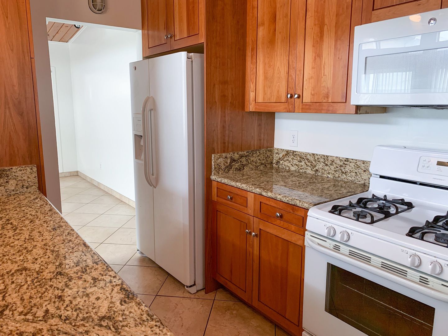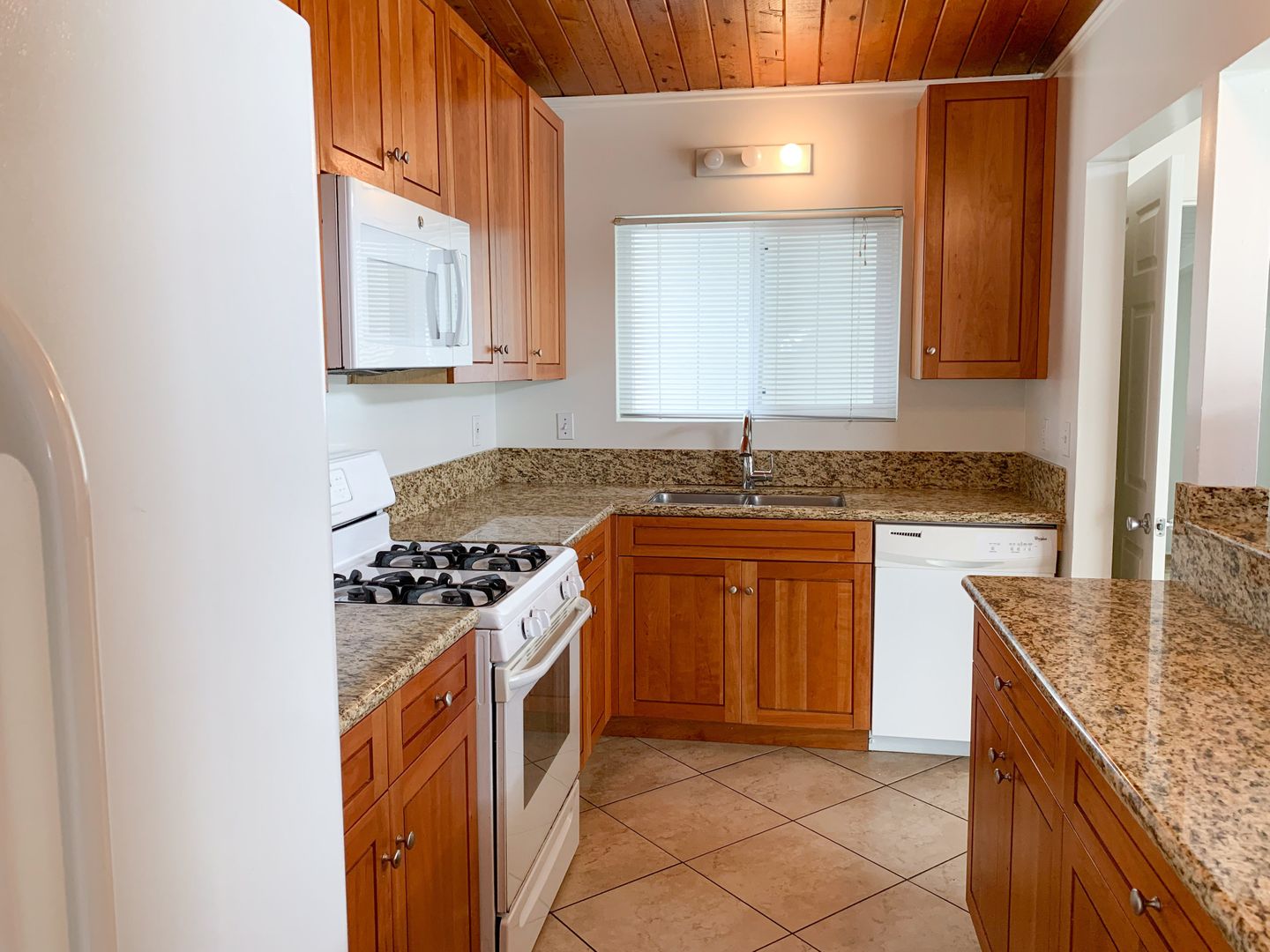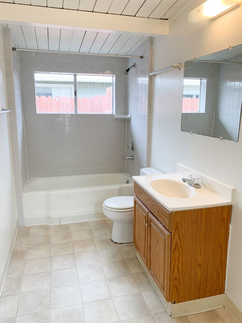 Tile flooring, updated cabinets & counter-tops, updated bathrooms, vaulted natural wood ceilings, and TONS of natural light. I dare you to get this apartment before someone else does. It is our quickest renter. We pay water and trash.