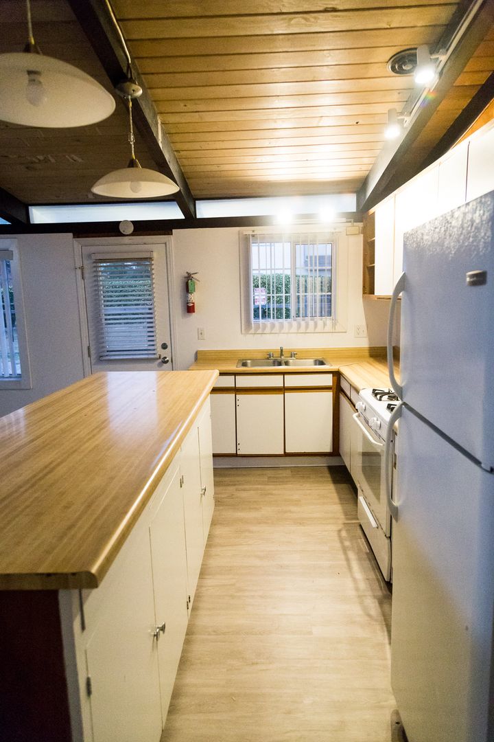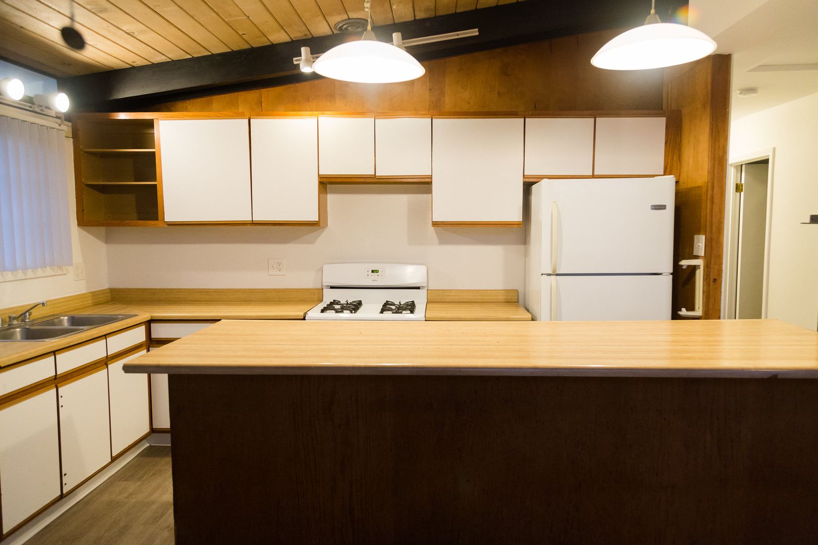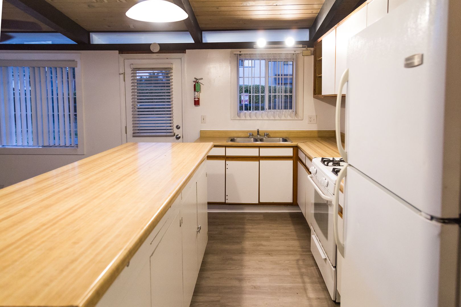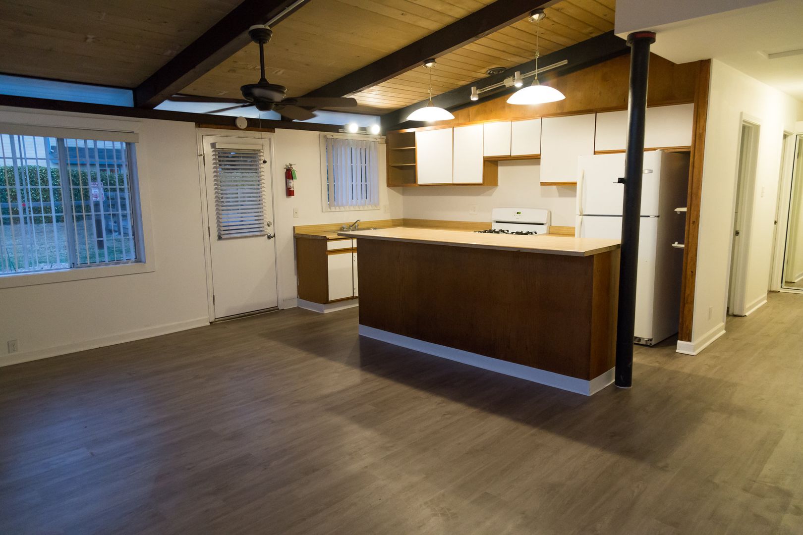 3 bedroom! Ranch-style duplex with vaulted, open beamed ceilings and vinyl plank flooring throughout.